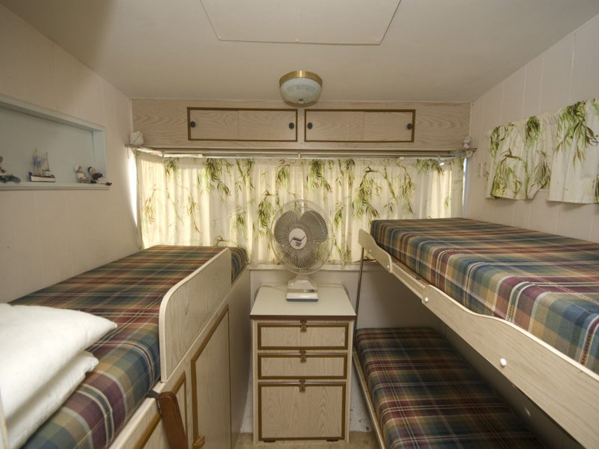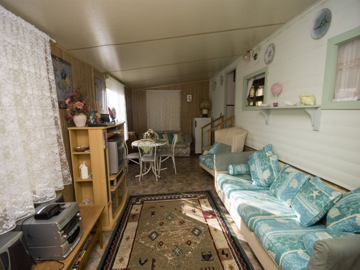 The annex has been set up as a comfortable living area with a lounge and dining area whilst the van has a double bed, kitchen, bunk beds and another single bed.